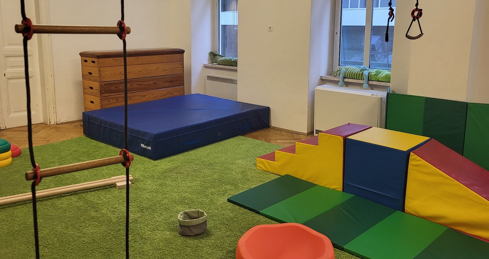 Unser Bewegungsraum ist eine kleine Entdeckerwelt, ausgestattet mit vielen spannenden Elementen wie der Sprossenwand, Ringen, einem Turnbock, einem Tunnel und vielen weichen Schaumstoffbausteinen. Es werden jedes Mal verschiedene Bewegungslandschaften, Hindernisse und Herausforderungen aufgebaut. Dein Kind kann klettern, hüpfen, balancieren, rutschen und einfach in Ruhe alles ausprobieren, was es gerade interessiert – und du bist als vertraute Bezugsperson immer dabei, um zu begleiten und zu ermutigen.